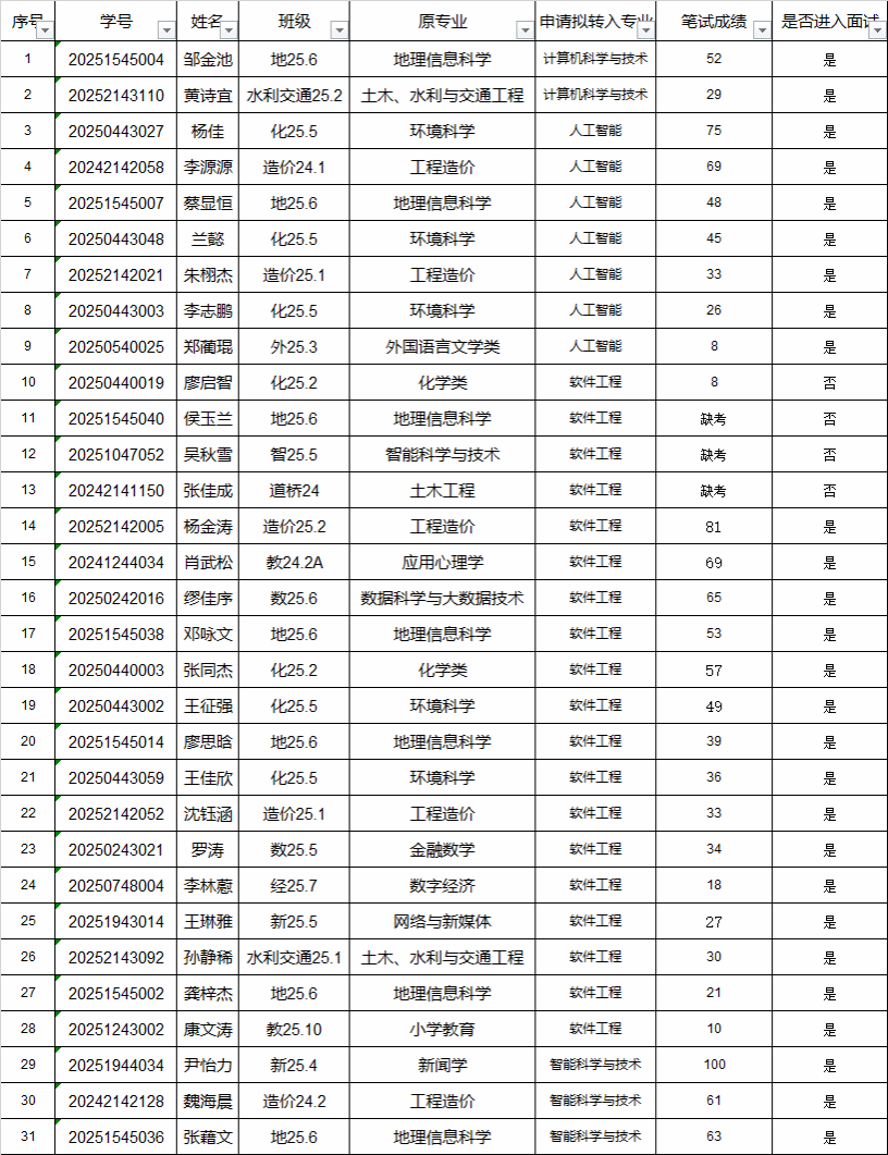 以上为人工智能学院2025-2026学年转专业学生笔试成绩和进入面试名单,请上述进入面试名单的同学于2025年12月19日上午8:30在格致楼228室进行签到。