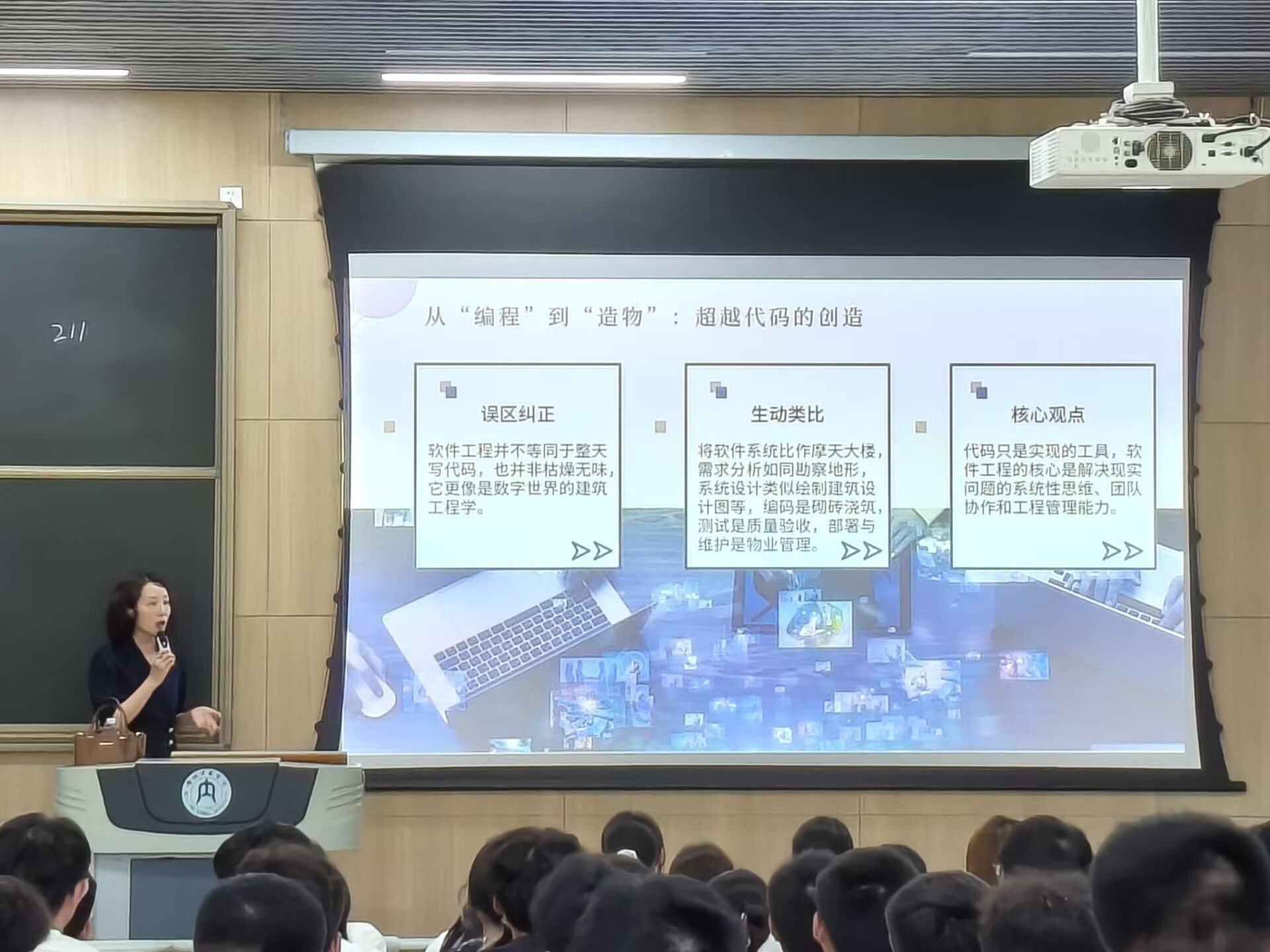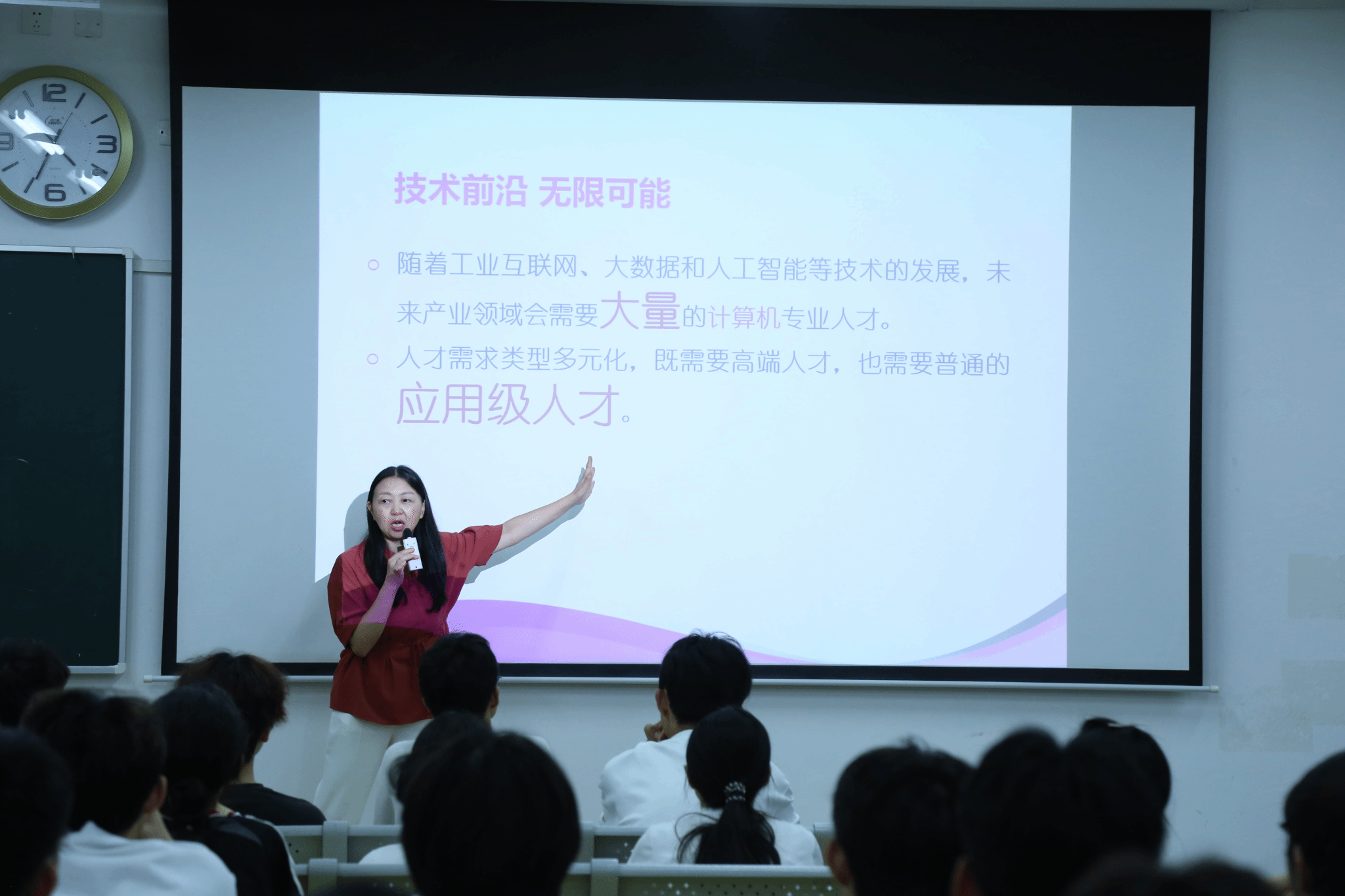 9 月 16 日,于永彦书记与新生们亲切会面交流。他强调,大学学习不再是单一的知识灌输,要学会自主探索,主动挖掘学科深处的奥秘;要勇于创新,敢于对现有知识提出疑问,以积极的姿态去追寻真理、增长才干。汪在荣院长则聚焦计算机类专业的学习特性,为新生们带来专业学习 “导航”,同时结合新生入学教育的核心目标,叮嘱大家要尽快完成从 “被动接受” 到 “主动探索” 的学习模式转变,多参与实践项目、学科竞赛,在 “学练结合” 中培养专业思维与创新能力,真正适应大学专业学习节奏。蒋明芳副书记鼓励同学们从入学之初就做好职业规划,树立 “好好学习” 的明确目标,课上紧跟老师思路、高效吸收知识,课后勤于复盘巩固、主动攻克难点,用扎实的学习态度筑牢大学成长的 “第一块基石”。