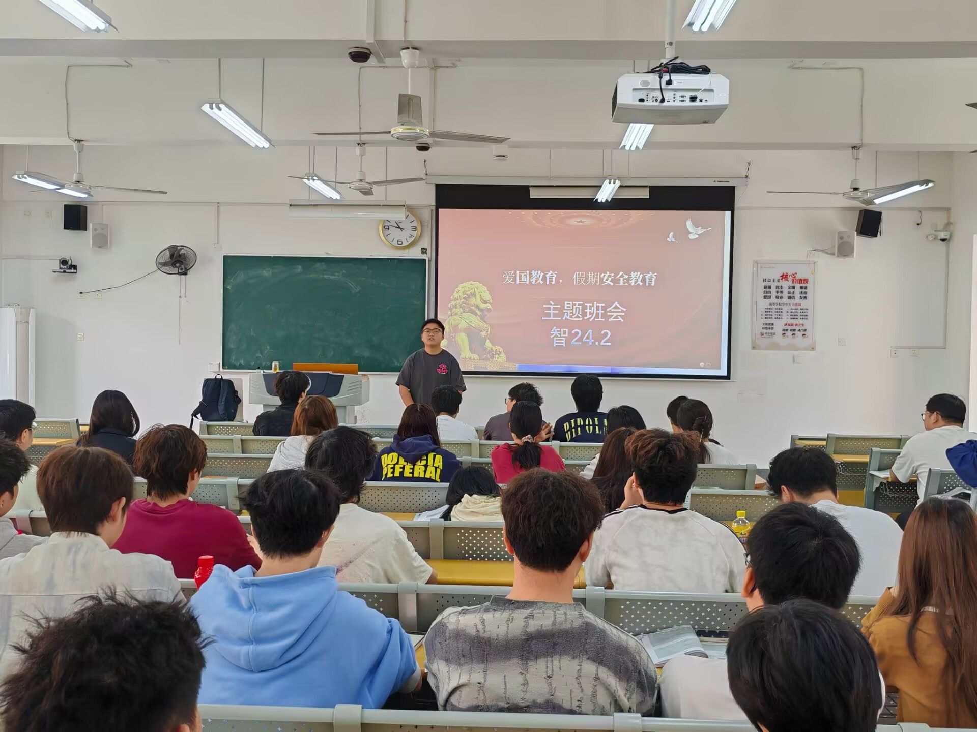 为激发师生爱国情怀、筑牢假期安全防线,在国庆佳节来临之际,我院各班于9月24日在明德楼B315教室开展了以“爱国教育与假期安全教育”为主题的班会。