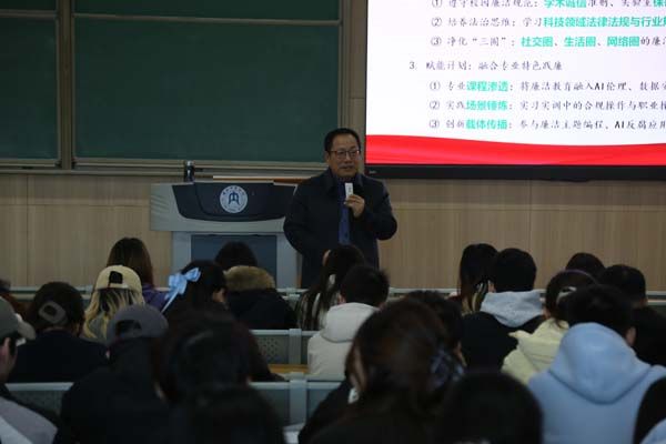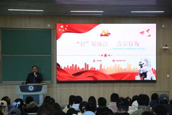 为引导大学生扣好廉洁“第一粒扣子”,2025年11月19号下午16:00,人工智能学院党委书记于永彦老师在明德楼B110开展“‘智’敬廉洁,青春有为”大学生廉政教育主题党课,为2023级1班、2班、3班全体青年筑牢廉洁思想防线。