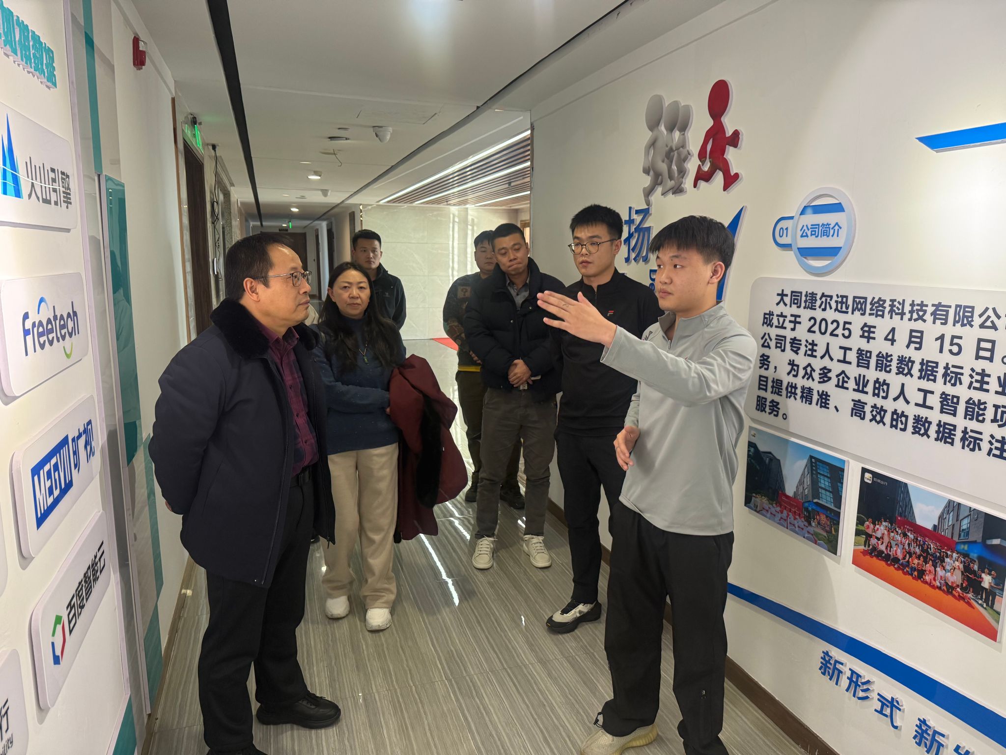 在大同市捷尔迅网络科技有限公司,首先参观了企业展厅:从简介墙了解到,该公司核心业务聚焦人工智能数据标注,为企业AI项目提供精准数据服务。随后进入“大同数字人才培养训练营”办公区,现场观摩了数据标注实操场景,企业人员介绍了岗位技能需求与人才成长路径,双方就实训内容设计、岗位适配标准展开交流。随后,前往山西宏盛星辰网络科技有限公司,参观企业办公区域并开展座谈。企业方围绕数据处理、技术服务等业务,介绍了行业人才缺口;学院则结合专业课程体系,提出校企协同培养的具体方向。