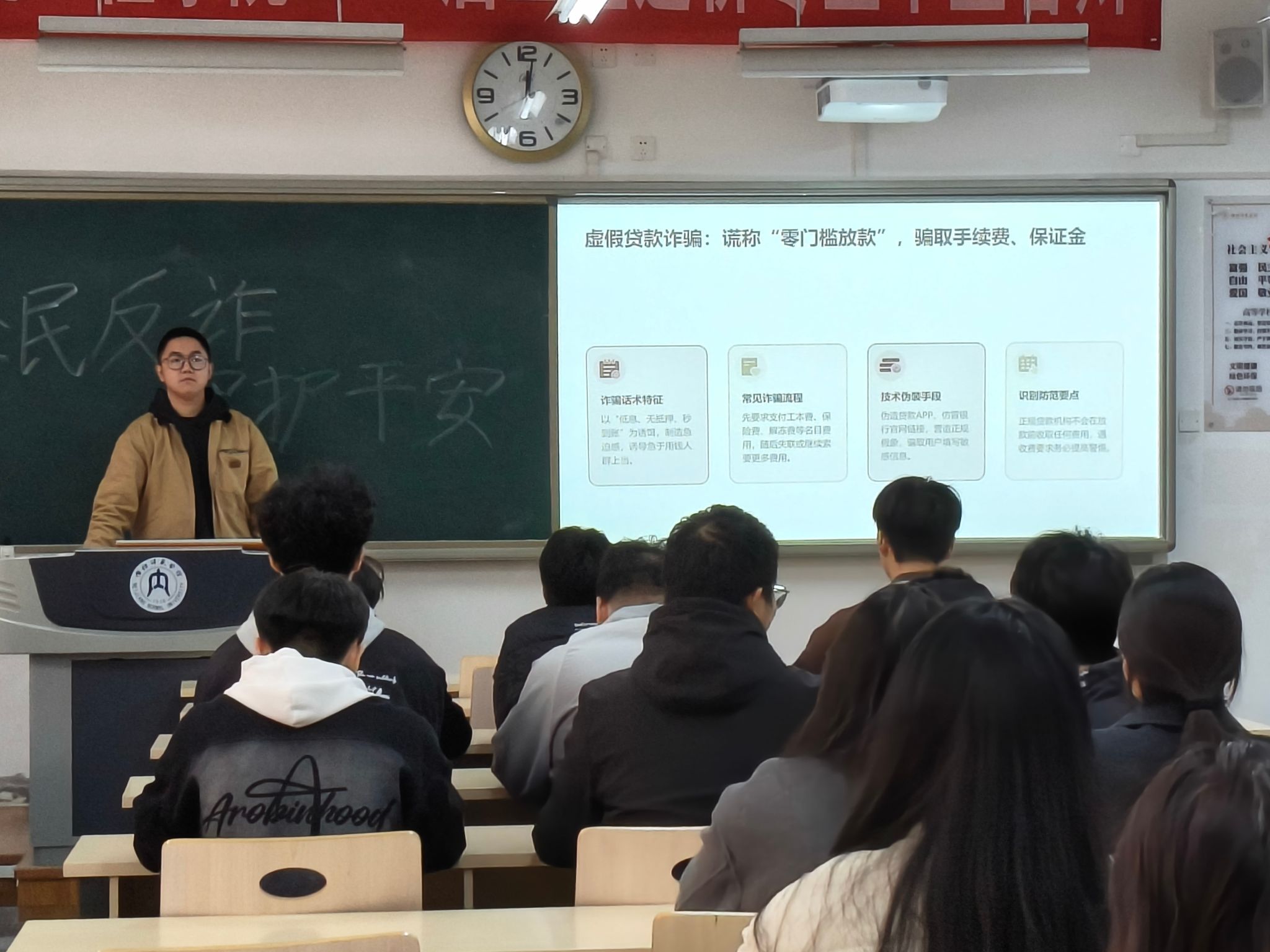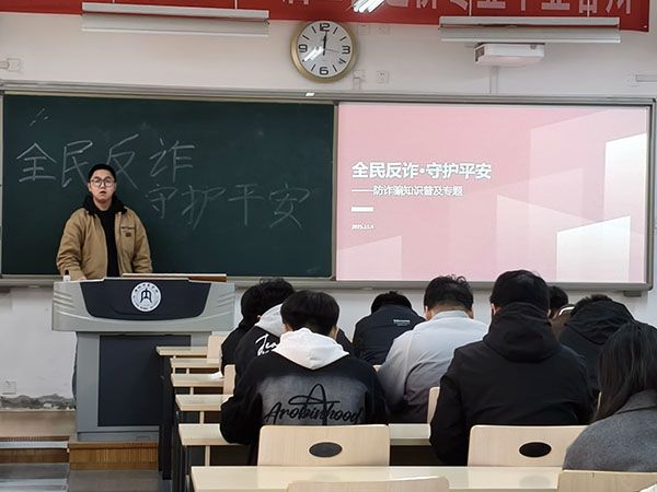 为强化2025级新生防诈意识,普及反诈知识,提升风险应对能力,有效遏制校园诈骗案件发生,我院25级各班于11月2-4日在明德楼各教室开展主题反诈班会。黑板上“全民反诈,守护平安”八个醒目大字点明核心主旨,班级学生全员参与,由各班班长担任主讲人,聚焦反诈知识开展主题班会。