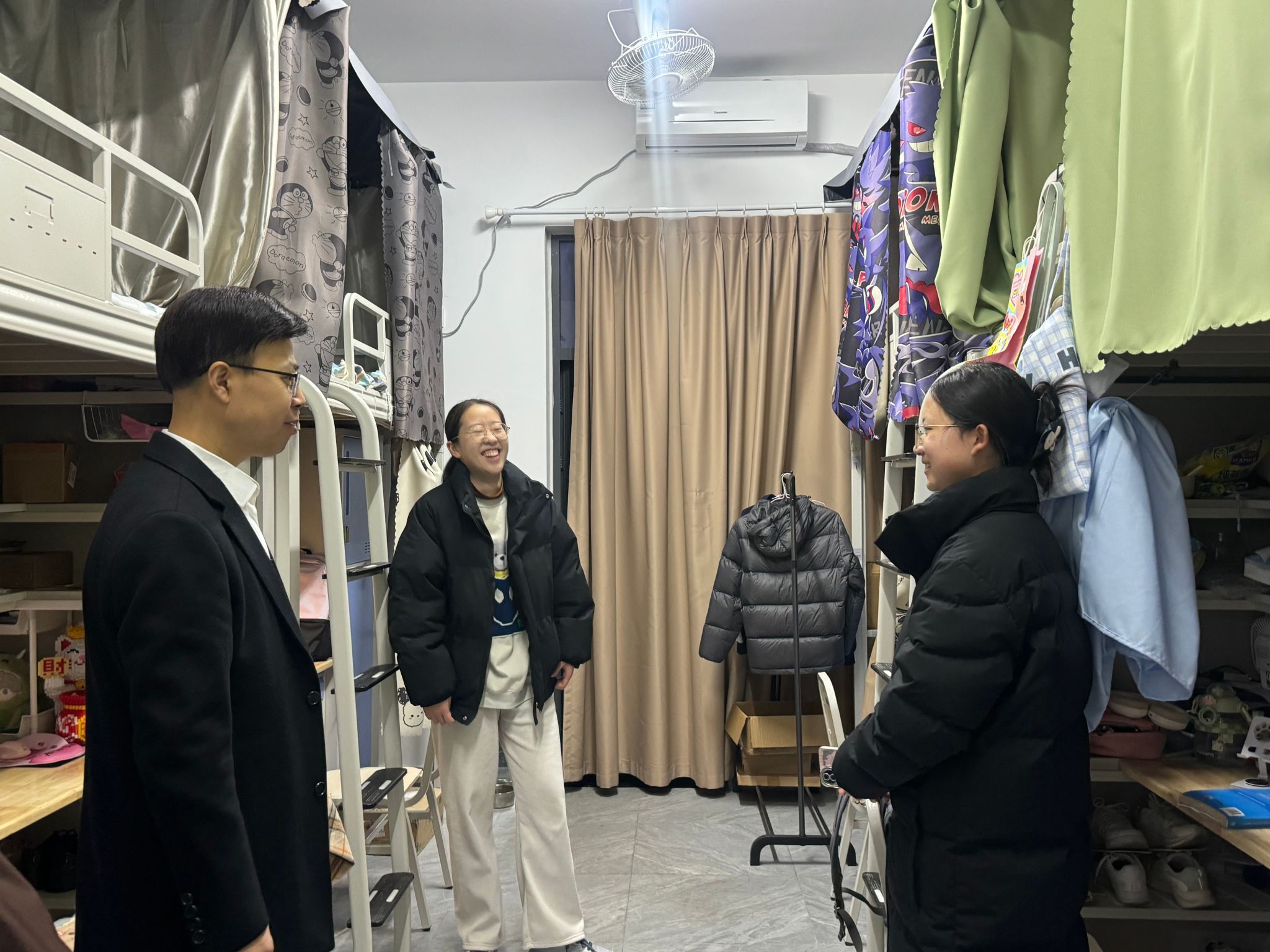 2025年11月26日,内江师范学院党委常委、副校长胡金朝在我院团委书记、学工办主任俞守绪以及班主任林琳老师的陪同下,深入我院学生宿舍21-3B为同学们送去了关心与温暖。