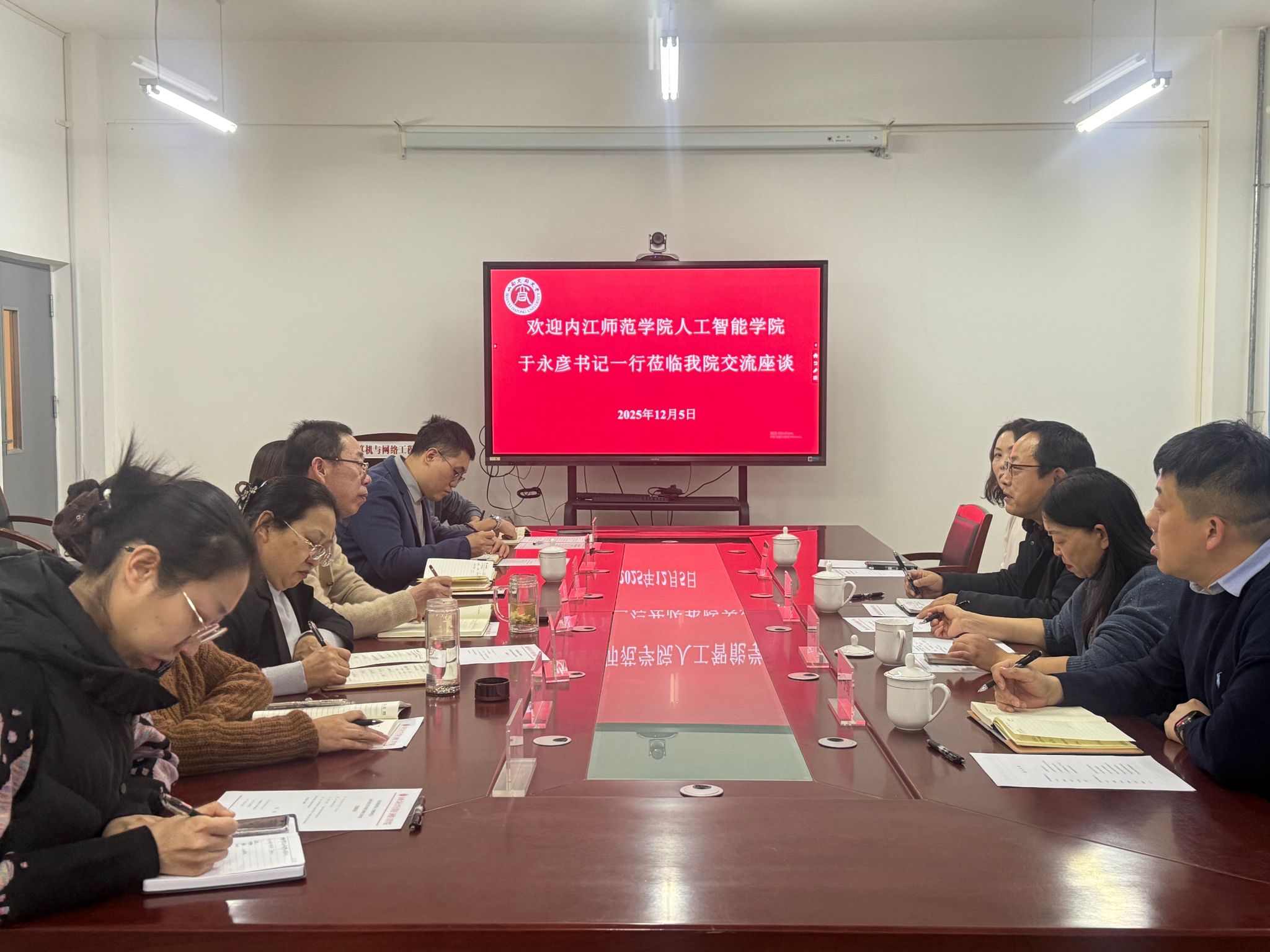 为进一步加强区域高校间的沟通合作,推动专业建设、人才培养与科研发展的深度交流。2025年12月5日,内江师范学院人工智能学院书记于永彦、计算机科学与技术专业负责人胡晓容、软件工程专业负责人唐春兰、团委书记、学工办主任俞守绪老师前往山西大同大学计算机与网络工程学院开展调研考察。双方在大同大学本真楼205会议室举行交流座谈会。会议由大同大学计算机与网络工程学院党委书记马云波主持。