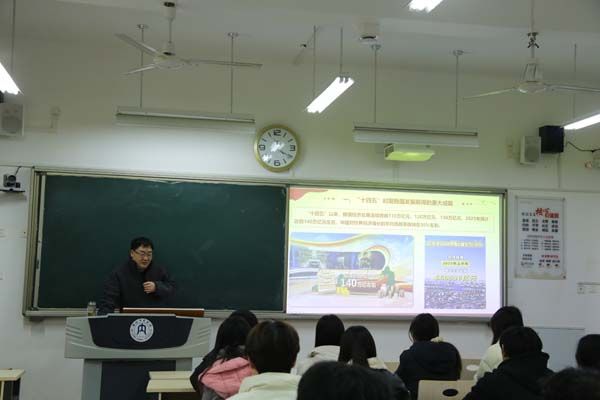 讲座以“十五五”时期发展规划为核心展开。唐书记首先回顾“十四五”时期发展成就:我国经济总量连跨十万亿元级台阶,2025年预计迈过140万亿关口,对世界经济增长年均贡献约三成,彰显出强劲经济韧性。随后,唐书记系统解读了“十五五”时期经济社会发展的指导思想、主要目标、遵循原则及重要部署,从宏观战略到具体方向梳理新时代发展核心脉络,强调要锚定强国建设目标,把握时代方位、践行使命担当。讲座主题鲜明、逻辑清晰,兼具政策理论深度与实践总结温度,助力师生深刻领会党的二十届四中全会精神核心要义,进一步增强了立足新时代、奋进新征程的思想自觉与行动自觉。