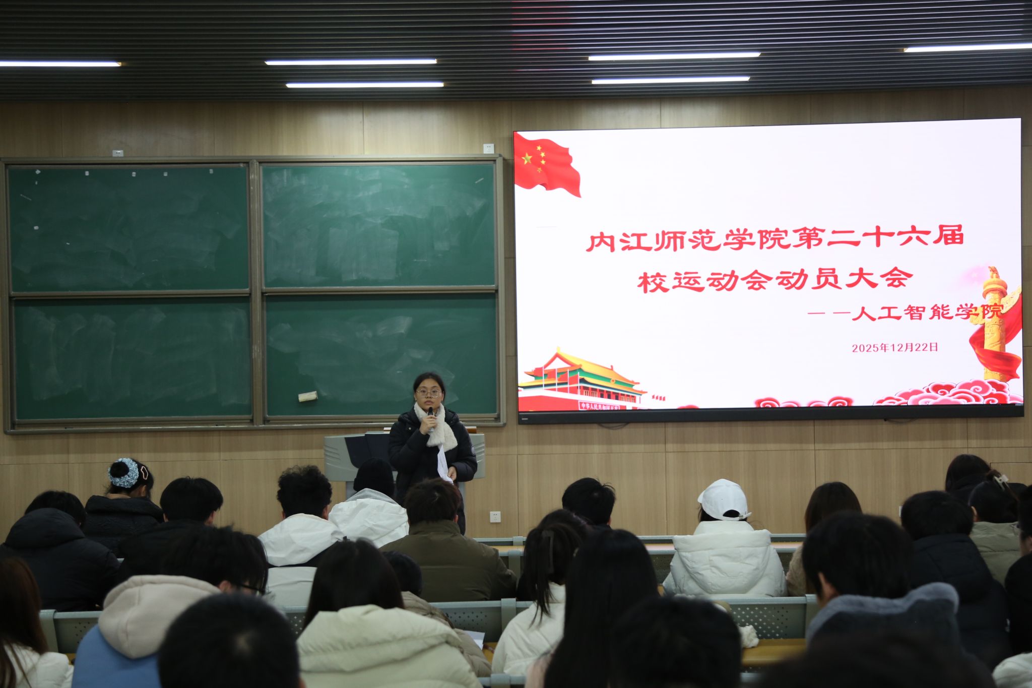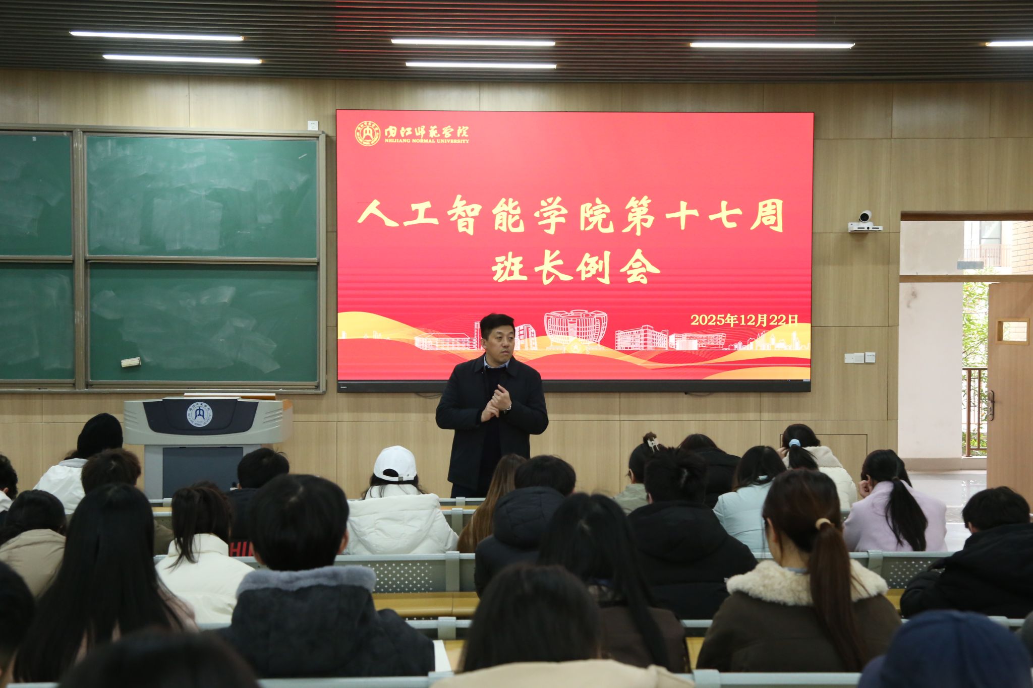为统筹推进期末各项工作、强化校园管理与学生服务,2025年12月22日12:40人工智能学院于明德楼B111召开第十七周班长例会。本次例会由团委书记、学工办主任俞守绪主持,辅导员林琳、周宜蓓、廖新梅、杨济宁老师及23、24、25级各班班长、团支书、学委参会。