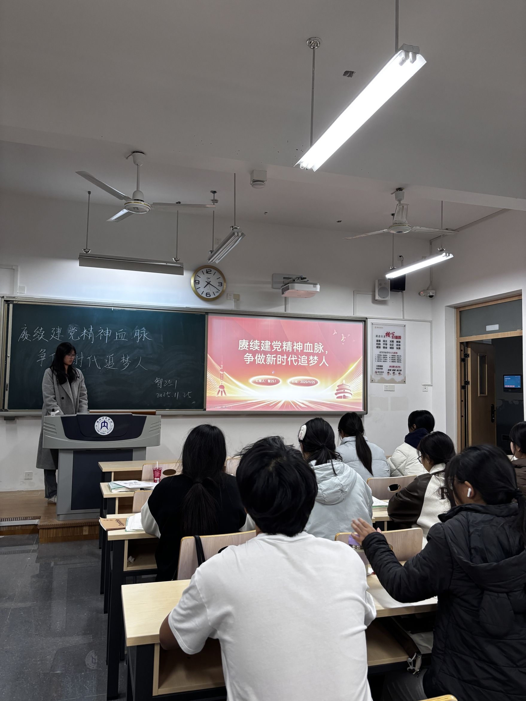各班班会紧扣主题且形式鲜活。各班班长以红色影像资料、历史故事为切入点,结合班级日常学习、学科竞赛、志愿服务等真实经历,阐释“坚持真理、坚守理想,践行初心、担当使命,不怕牺牲、英勇斗争,对党忠诚、不负人民”的精神内涵,用身边事讲清精神内核。互动环节,学子们围绕“我的追梦宣言”交流感悟,有同学提到要以“坚持真理”的态度攻克专业难题,也有同学表示将以“不负人民”为指引参与志愿服务,现场讨论氛围热烈。各班还同步发起“赓续精神,追梦有我”倡议,明确主动学习红色知识、参与学科实践、投身志愿服务的行动方向。