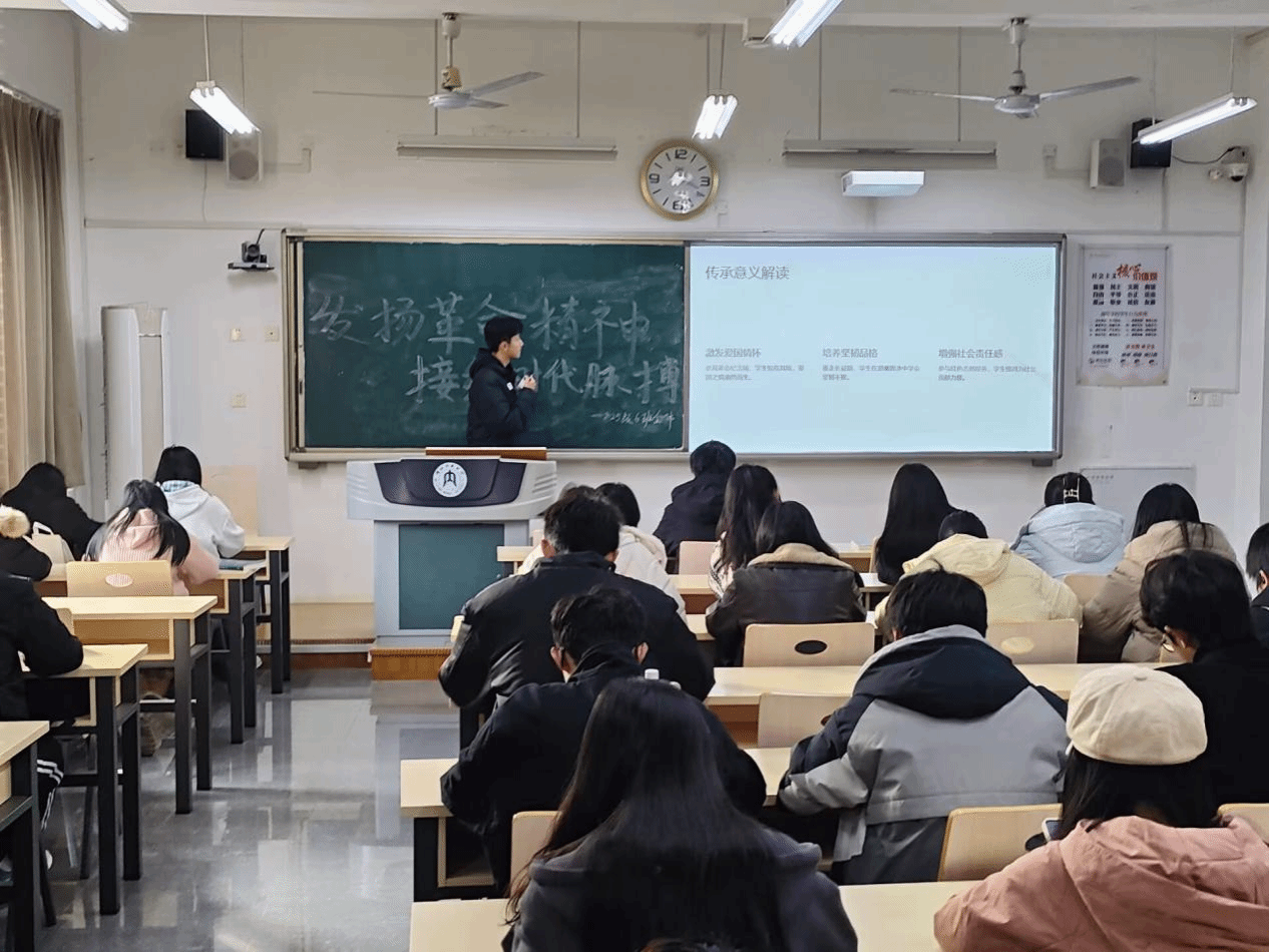 最后,班长强调,传承革命精神关键在于自觉践行。革命精神并非遥远的丰碑,而是可践行的行动指南,在实验室钻研数据、参与社区志愿服务,都是对“实事求是”“人民至上”精神的鲜活诠释。鼓励大家立足专业学习、投身志愿服务、锤炼扎实作风,让奋斗成为青春最亮丽的底色!